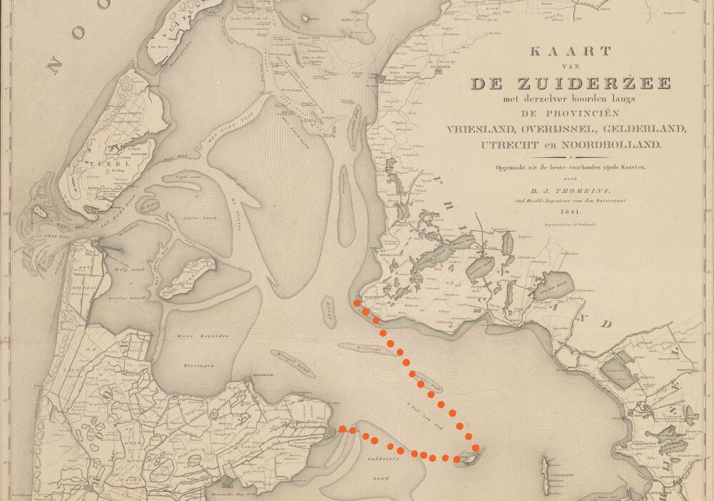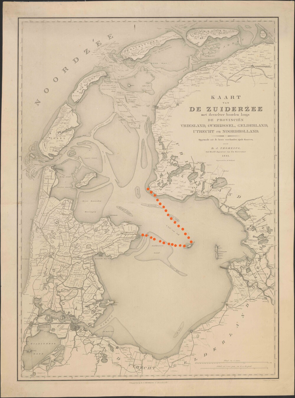De Afsluitdijk van Van Putten, ingetekend op een kaart van de Zuiderzee van Daniël Veelwaard uit 1841