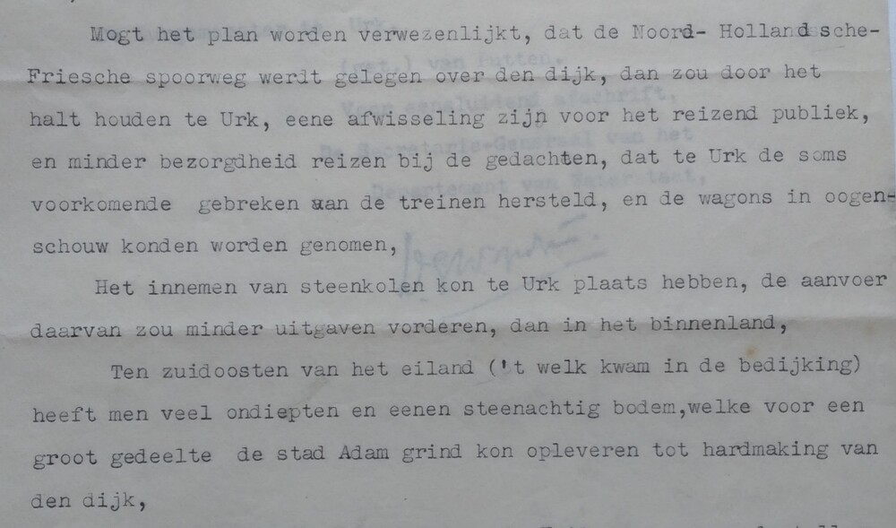 Mocht de ‘Noordhollandsche-Friesche Spoorweg’ over de dijk lopen, dan vormde Urk een plezierig tussenstation. Urk zou zorgen voor ‘eene afwisseling … voor het reizend publiek’, met minder zorg omdat hier gebreken aan de treinen konden worden hersteld. Het depot voor steenkool kon op het eiland worden gevestigd, wat de prijs van aanvoer zou drukken. Na aanleg van de treinlijn kon het gebied ten zuiden van Urk worden ingepolderd.
