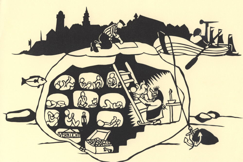 Voor de kust lagen drie grote stenen, de ‘aolstien’, ‘botstien’ en de ‘ommelebommele’. Die laatste werd ook wel Ommeldemoerstien genoemd: dat was het domein van de Urker vroemoer (vroedvrouw). Aanstaande vaders konden hier –tegen betaling – hun nieuwe spruit ophalen. Bij eb kwamen de grote stenen deels droog te liggen; sommigen lieten zich zelfs bij zo’n steen fotograferen.