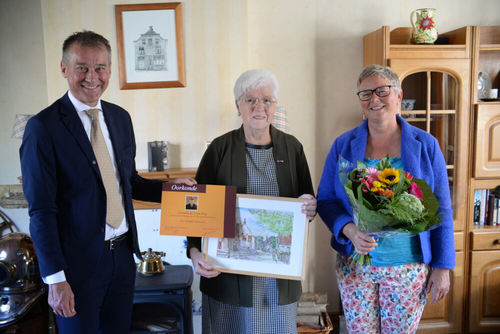 De Stichting Urker Uitgaven/Erfgoed Urk is trots om vandaag de Cornelis de Vries-prijs uit te reiken aan Alie Scheffer-Hakvoort. Alie is de eerste vrouw aan wie deze prijs ontvangt, en zij is een terechte kandidate. Van 1968 tot heel kort geleden zette zij zich op haar eigen, unieke manier in voor het erfgoed en de geschiedschrijving van Urk. Want wie kent de artikelen van Alie niet, in het Urker Volksleven, over de winkels en buurtjes van toen? Ruim 60 schreef ze er, waarmee ze het overgrote deel van de talloze winkels die Urk vroeger rijk was, in kaart bracht.