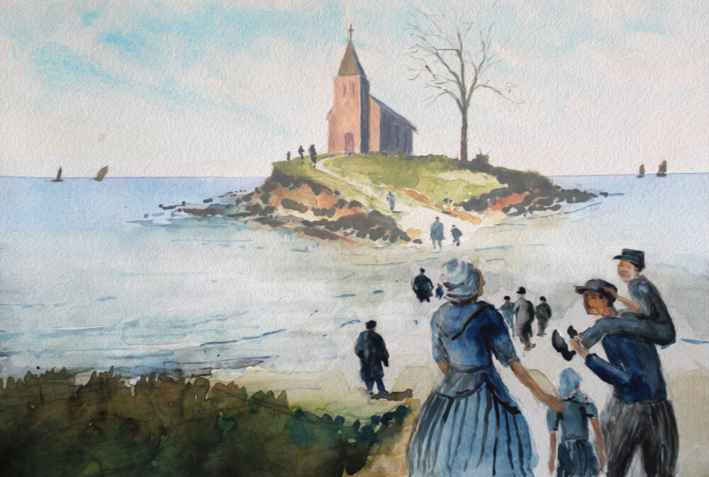 Illustratie van kerkgangers die naar de kerk van Espelo waden: Willem Blok